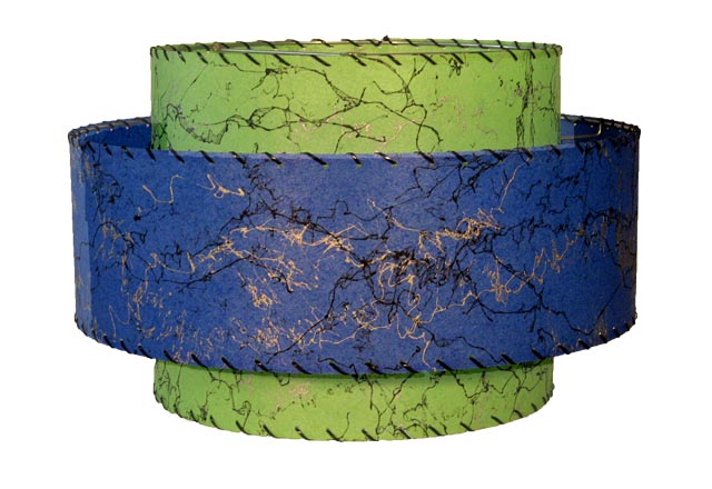 The free-form web design inspired by the American Abstract Expressionist painters (especially Jackson Pollock) was characteristic of 1950s modern lighting design. Black and white webs are shown here on all tiers of an XL (18″ diameter) three-tier lampshade (which can also be configured as a pendant lamp or ceiling light fixture). We can make this shade in any color combination (or in one color for all three tiers); Very interesting lighting effects can be achieved incorporating non-1950s colors into otherwise period-authentic lighting. Combining design elements from different eras is a great way create fresh, unique, and inspiring design. We make exact and authentic 1950s lighting replicas, as well as variations incorporating contemporary color palettes and designs.